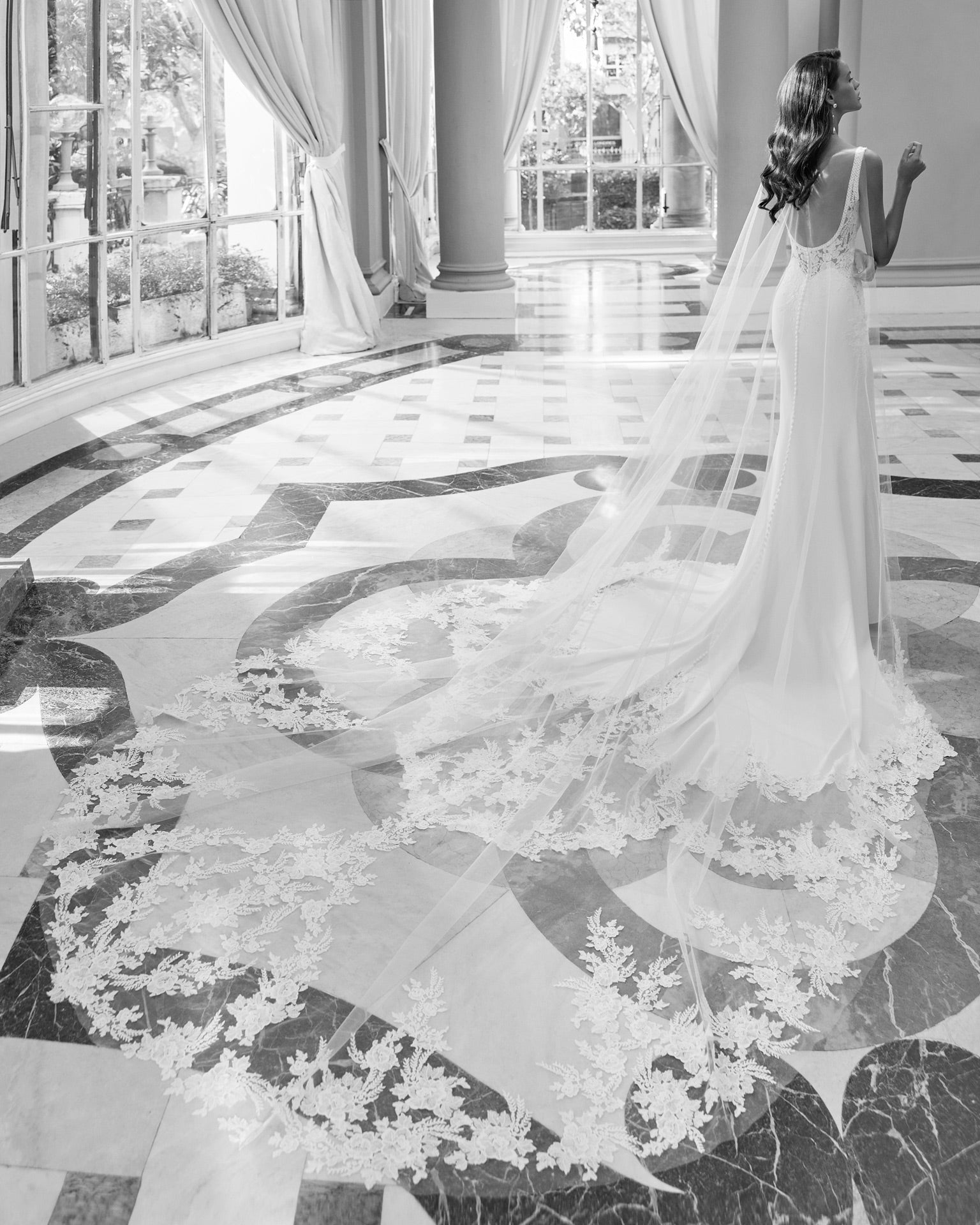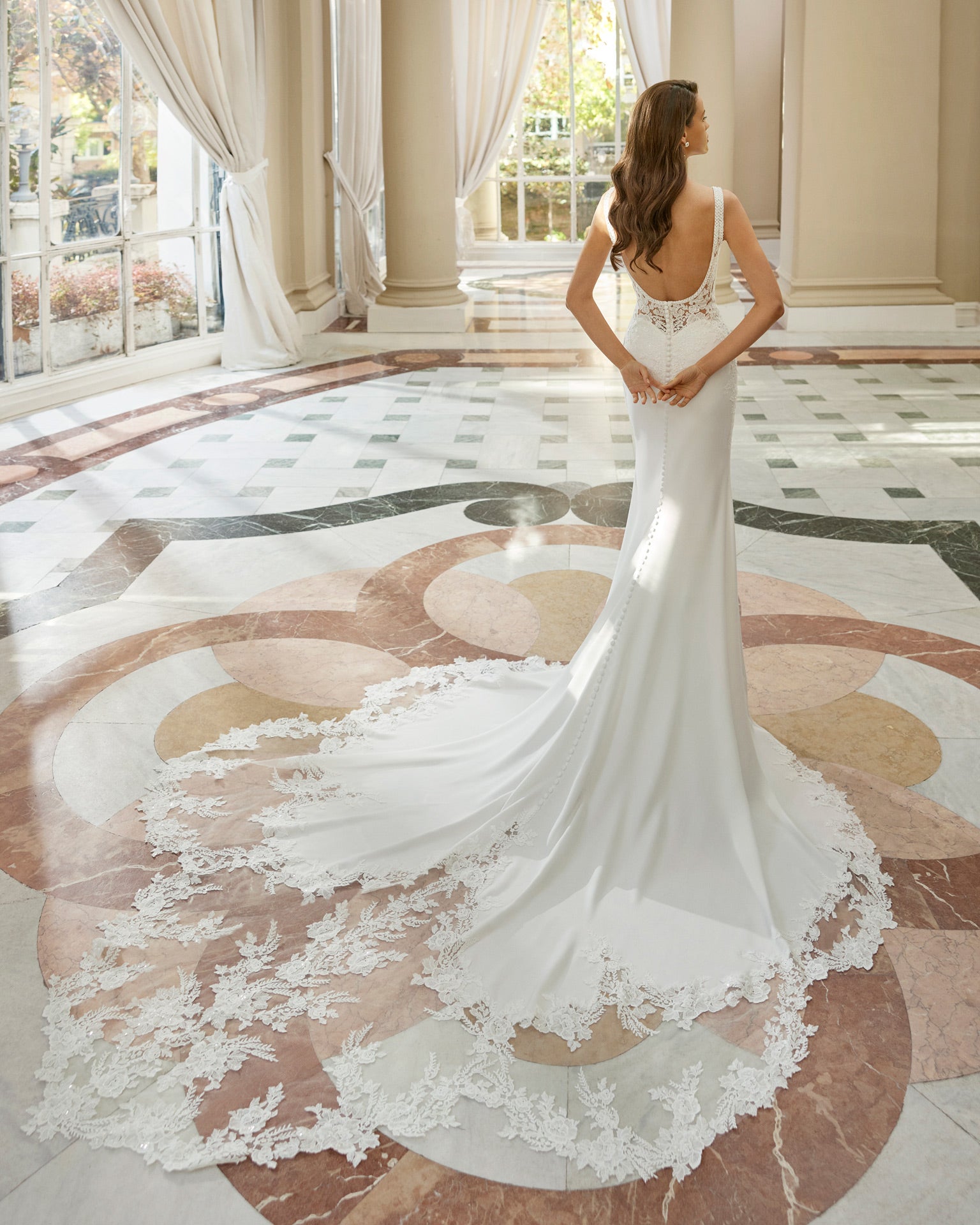 Vestido de novia sexy de corte sirena. Confeccionado en crepé elástico y encaje con pedrería. Escote en V, espalda abierta y encaje aplicado en cola.