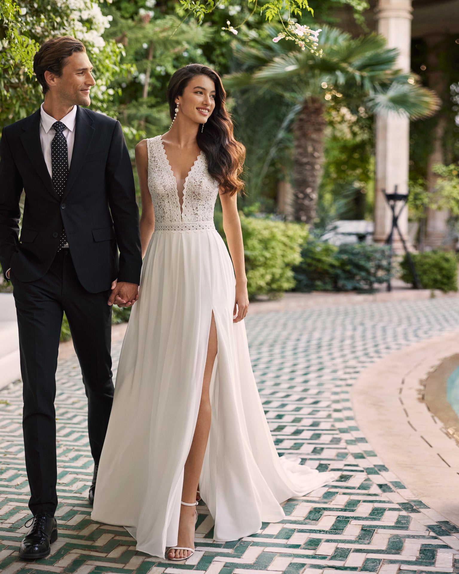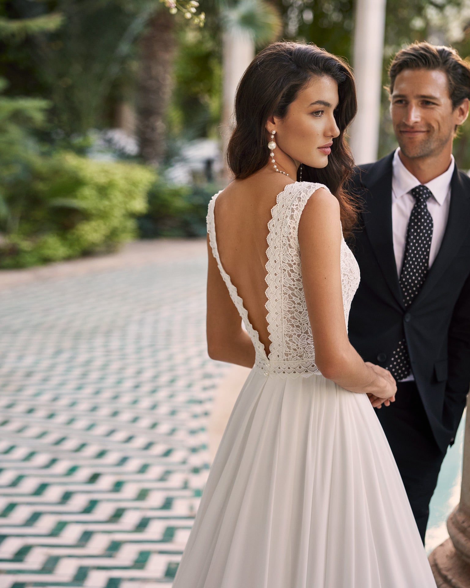 Vestido de novia de corte recto y estilo romántico, confeccionado en georgette y guipur. Con escote de pico, espalda en V y falda con abertura delantera, este modelo Adriana Alier es delicado.
