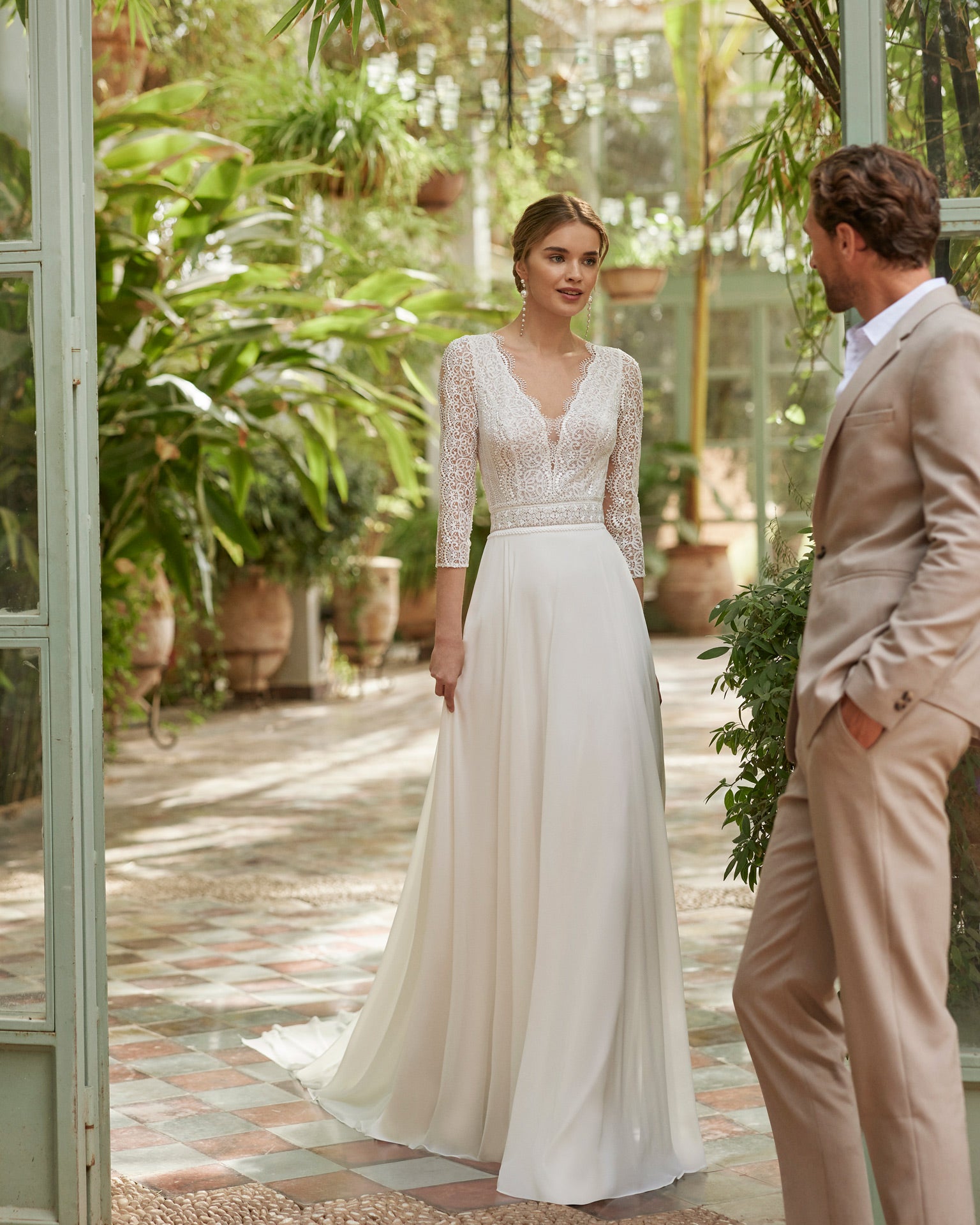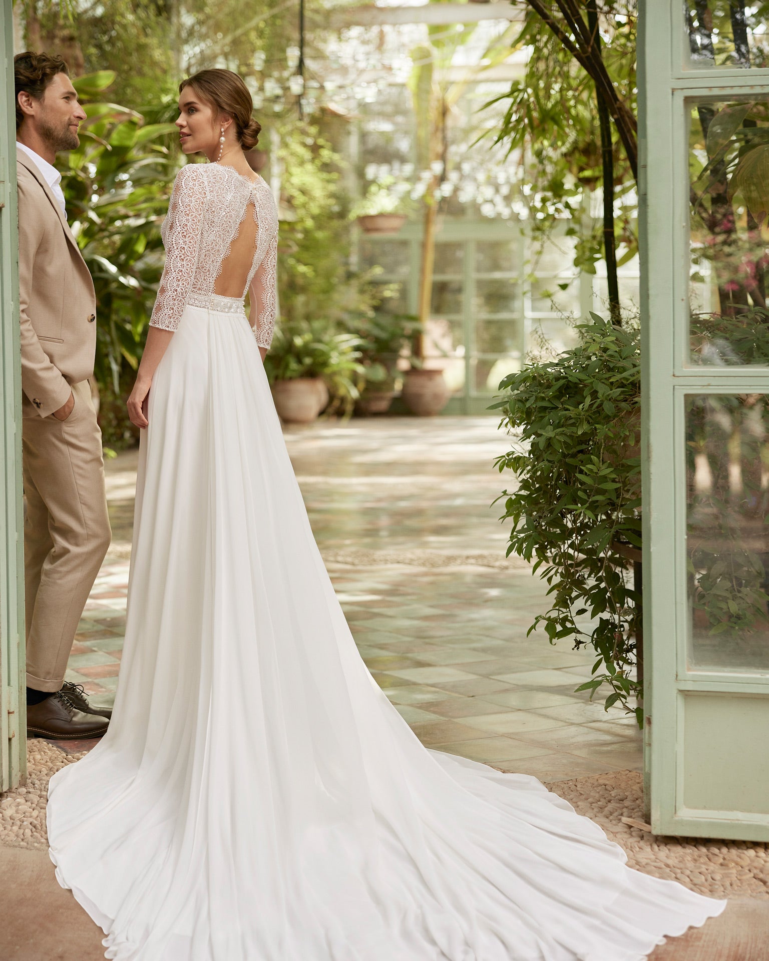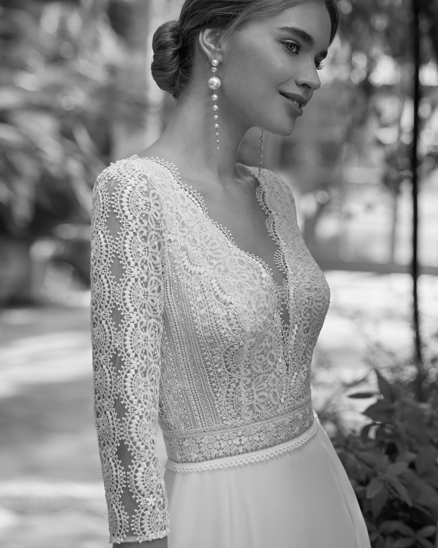 Vestido de novia con silueta en línea A, estilo romántico y realizado en encaje combinado con georgette. Un escote de pico, una espalda lágrima, una manga francesa y una cola extraible de georgette completan este delicado conjunto.