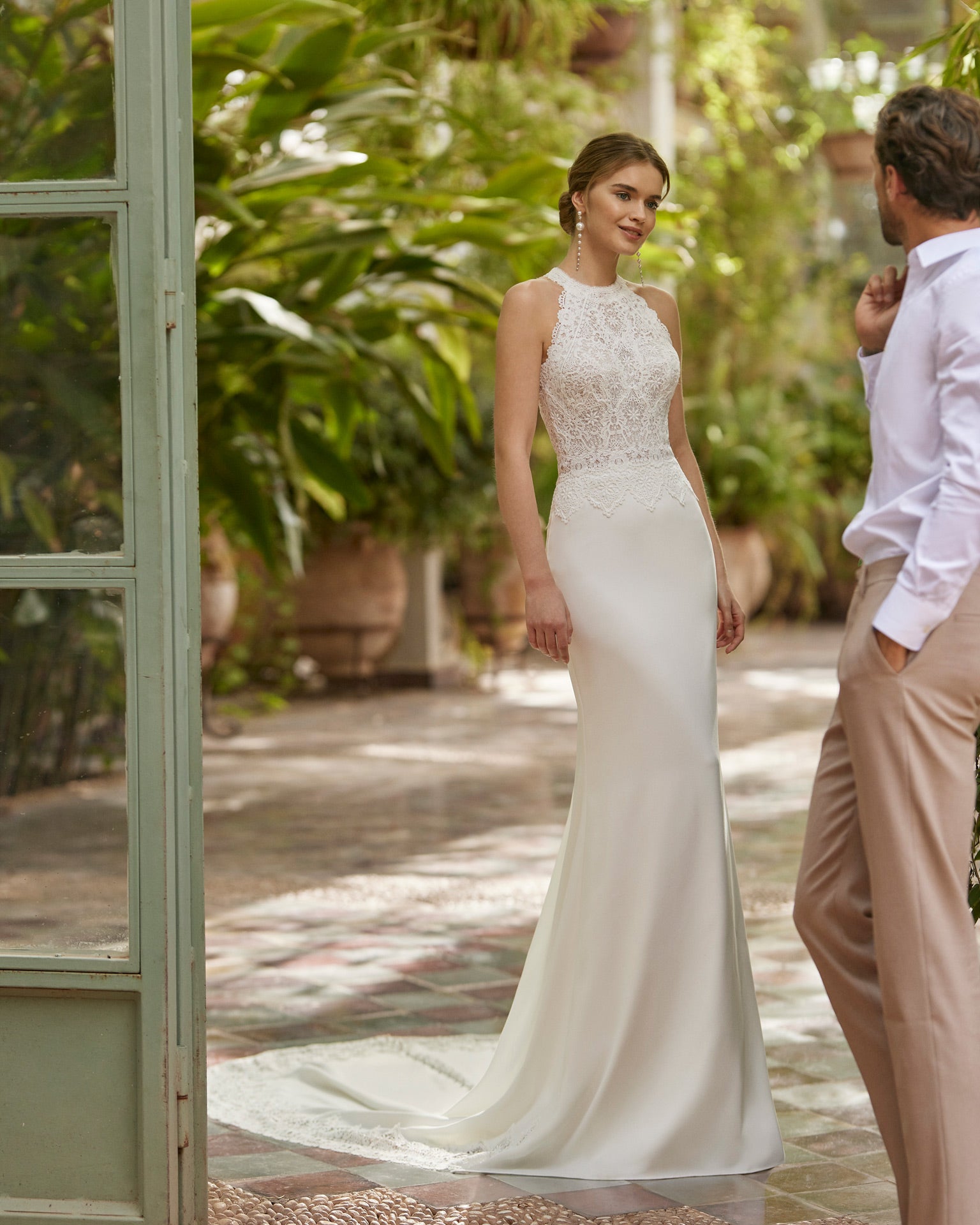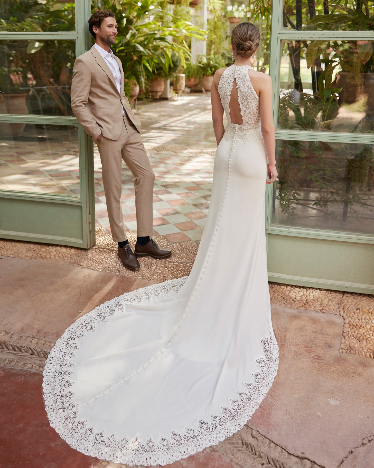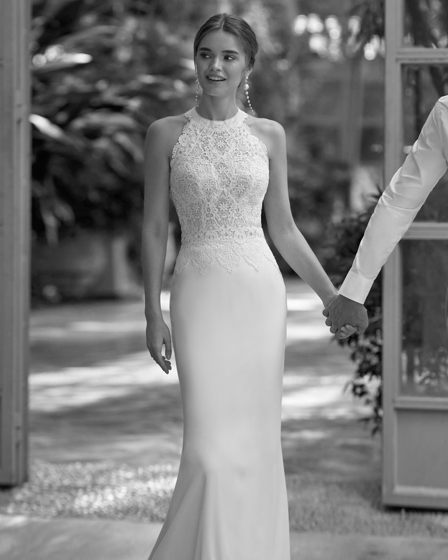 Vestido de novia de corte sirena y estilo sexy. Con body de encaje, falda en crepe, escote halter, espalda abierta y falda con ondas en el bajo crepé, este delicado modelo te hará ser la gran protagonista.