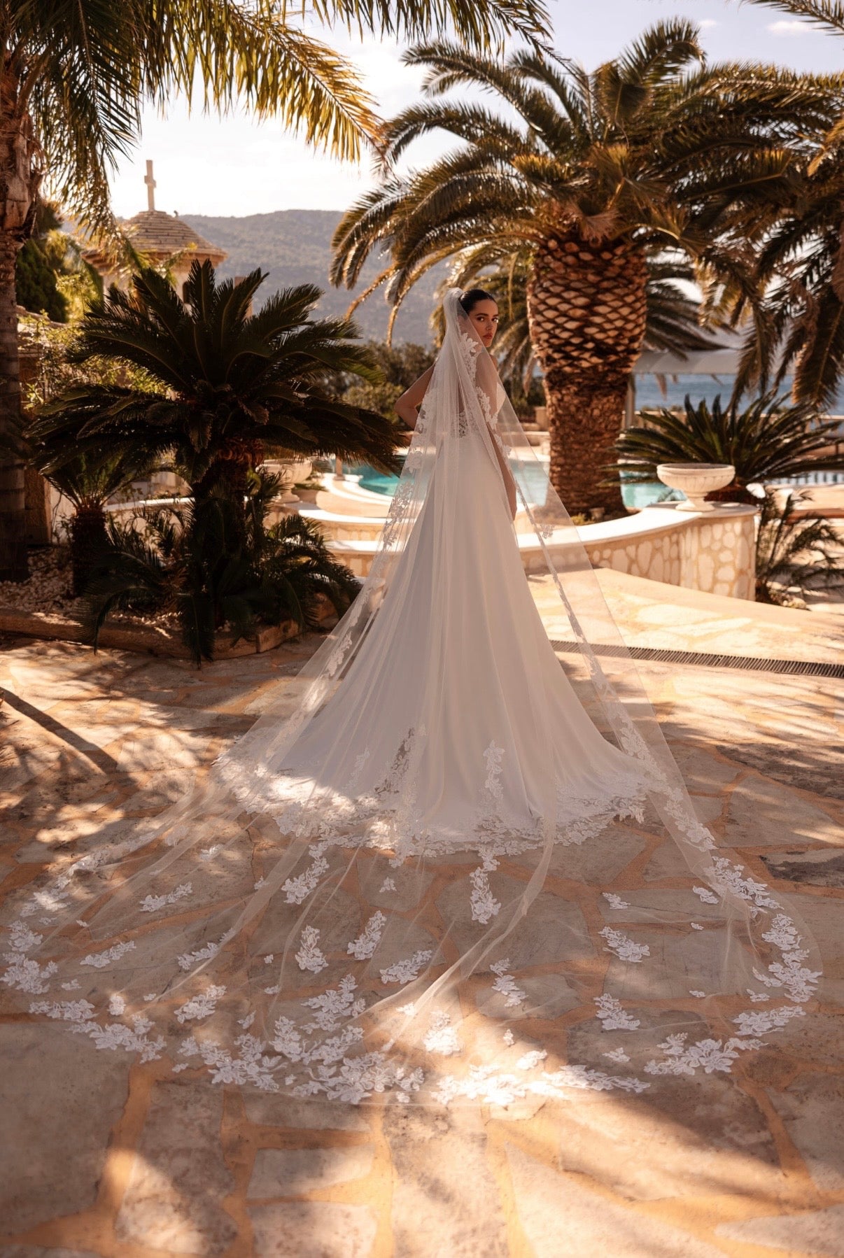 Este modelo es elegantemente sencillo, con un escote ilusión pronunciado, un corpiño de encaje bordado con pedrería y una falda de crepé estilizada. La silueta ligeramente acampanada termina en una cola romántica rematada en encaje.